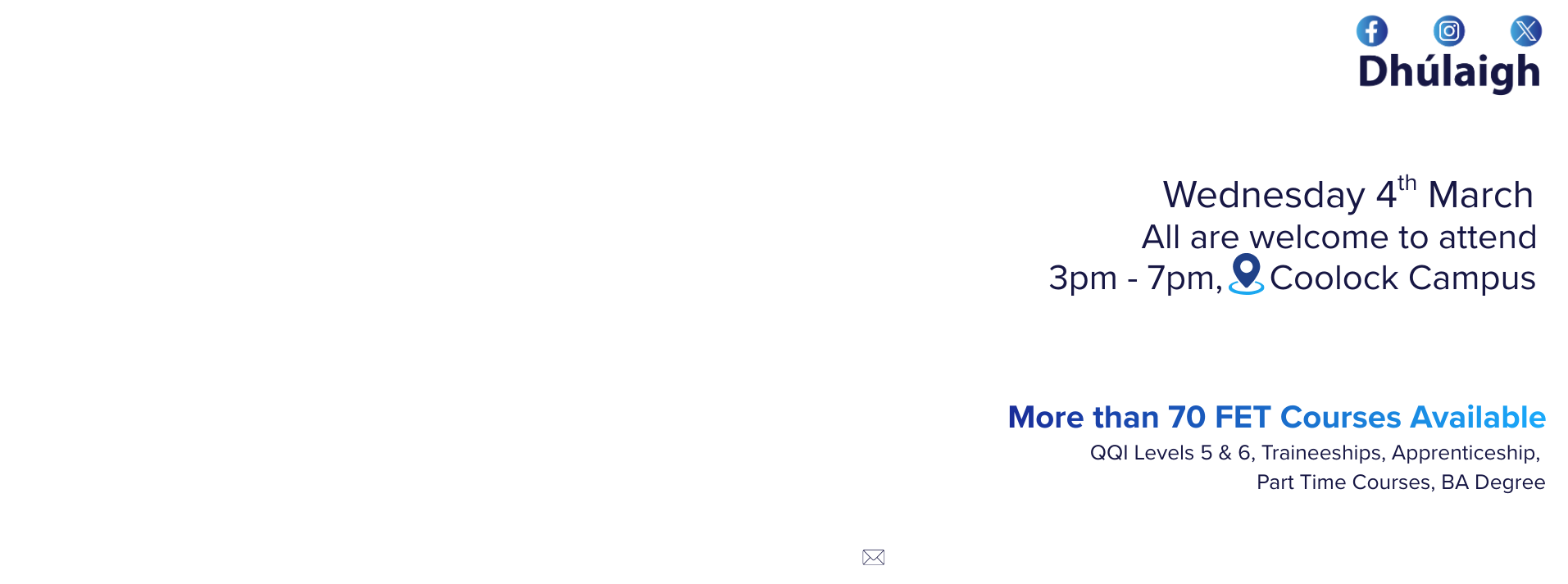 Check our website for the most up to date information about courses, open days, news & upcoming events. Follow our social media for updates on all that Dhúlaigh has to offer.