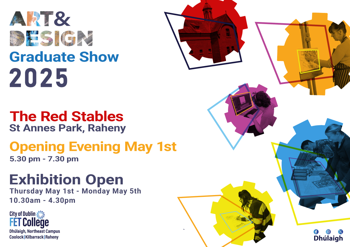 We are delighted to invite you to the official opening of our Art and Design Graduate Show at The Red Stables, St. Anne’s Park, on May 1st from 5:30 PM to 7:30 PM. This event will showcase the incredible talents of our graduates across various art and design disciplines. The exhibition will be on show in The Winter Garden until Sunday 5th May, all are welcome to come and enjoy these artworks.