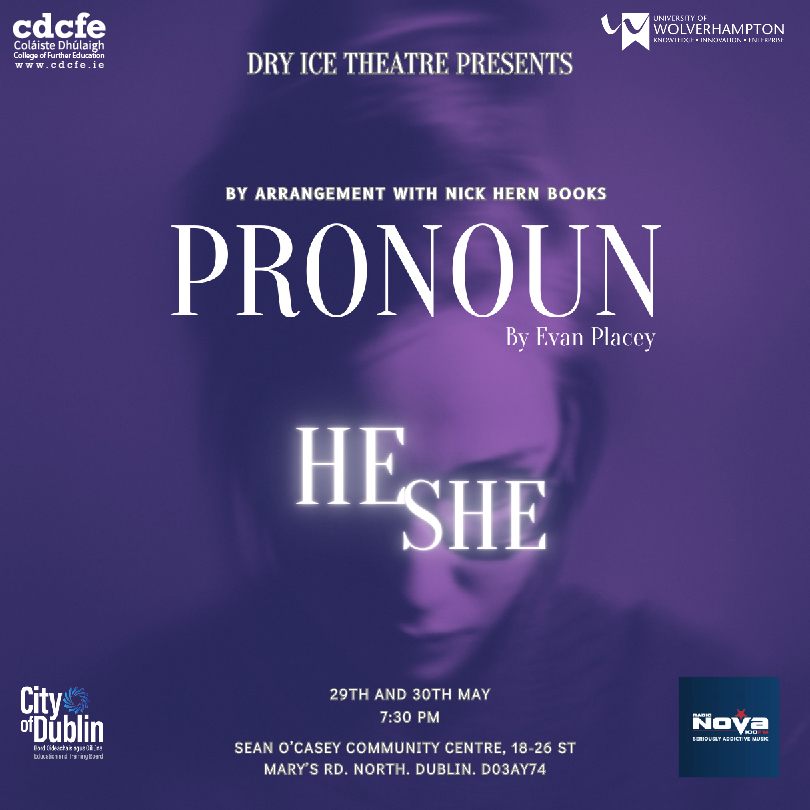 Dry Ice Theatre Company by the Perfoming Arts course at Coláiste Dhúlaigh College of Further Education are proud to present Pronoun by Evan Placey. ‘A love story about transition, testosterone, and James Dean. Josh and Isabella are childhood sweethearts. They were meant to spend their gap year together, they were meant to be together forever. But Isabella has now become a boy.’